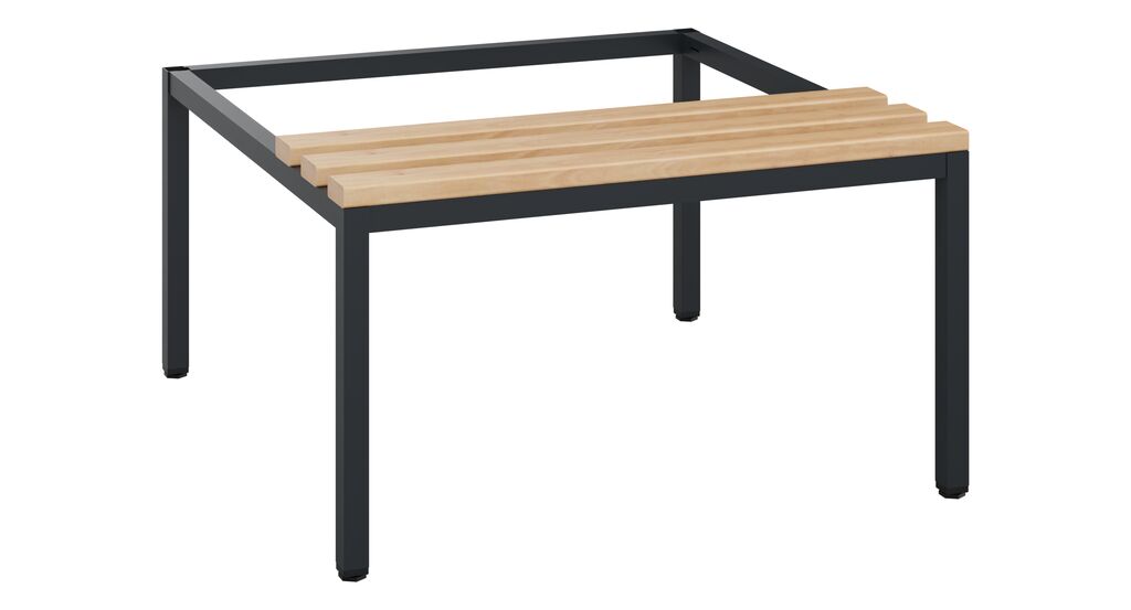 Untergebaute Sitzbank, Gestell aus stabilem Vierkant-Stahlrohr 30 x 30 mm, mit verstellbaren Bodengleitern für einfachen Niveauausgleich Sitzleisten aus Buche-Hartholz, im Profil ca. 60 x 30 mm, für guten Sitzkomfort, allseitig gehobelt, klarlackiert mit naturgegebenen Farbunterschieden, Maße (H x B x T): 420 x 800 x 815 mm, Gestell: RAL 7021 Schwarzgrau