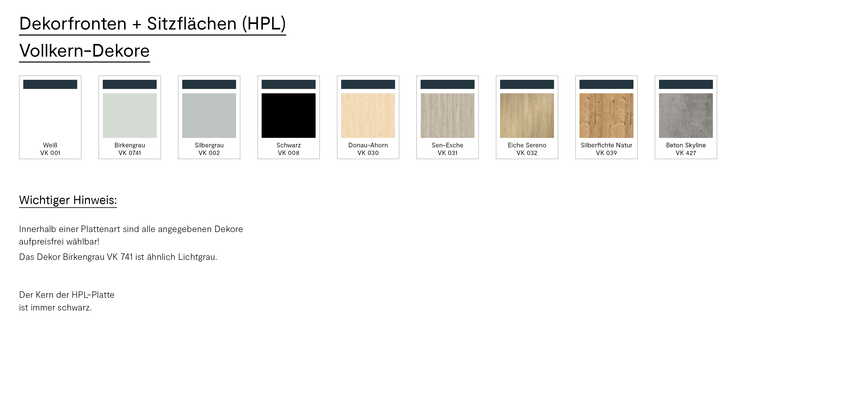 Unsere HPL-Dekore überzeugen durch eine hochwertige Verarbeitung, moderne Optik und funktionale Vorteile – ideal für alle, die bei Stahlmöbeln nicht auf Gestaltung verzichten möchten. Es handelt sich um Vollkern-Dekore, die besonders widerstandsfähig sind und über eine charakteristische Vollkernkante in Schwarz (13 mm) verfügen.